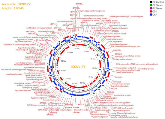 Infectious spleen and kidney necrosis virus (ISKNV)-ZY genome circle mapping using the Proksee online software (https://proksee.ca/, 7 January 2023). The orange portion denotes the predicted open reading frames (ORFs), with the arrow direction indicating the approximate size and transcription direction of the ORFs (https://www.ncbi.nlm.nih.gov/orffinder/, 7 January 2023). The blue part is the CD information subjected to a homology search using the NCBI BLASTp (https://blast.ncbi.nlm.nih.gov/Blastp, 7 January 2023) program. The circle diagram also shows the CG content and CG Skew distribution of the genome.
