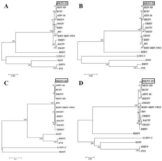 Phylogenetic relationship of infectious spleen and kidney necrosis virus (ISKNV)-ZY to other fish iridoviruses. Phylogenetic trees based on the amino acid sequences of DNA polymerase (A), Megalocytivirus major capsid protein (MCP) (B), ATPase (C), and ribonuclease III (D) were constructed using the MEGA software. All viral sequences are from the GenBank database (accession numbers: OSGIV, AY894343; ISKNV, NC_003494; RBIV, AY532606; BCIV, MN432490; RSIV-SBIV-VP13, ON740976; TRBIV, GQ273492; TSGIV, MG570132; SACIV, MG570131; SKIV-SD, MT986830; AFIV-16, MK689685; PIV, MK098185; SGIV, NC_006549; LCDV-C, NC_005902; EHNV, NC_028461; FV3, NC_005946; SDDV, KR139659).
