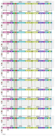 Genome collinearity between infectious spleen and kidney necrosis virus (ISKNV)-ZY and other Megalocytiviruses. Data were obtained on 8 October 2021 using the MAUVE software (http://darlinglab.org/mauve/mauve.html), which analyzes population evolutionary events through multiple sequence comparisons. Accession numbers of viral genomes are: OSGIV, AY894343; ISKNV, NC_003494; RBIV, AY532606; BCIV, MN432490; RSIV-Ku, KT781098; RSIV-SBIV-VP13, ON740976; TRBIV, GQ273492; TSGIV, MG570132; SACIV, MG570131; SKIV-SD, MT986830; GSIV-K1, KT804738; AFIV-16, MK689685 and PIV, MK098185.