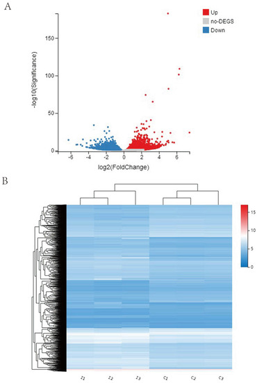 The spleen tissues of 12 virus-infected largemouth bass were collected and randomly divided into three groups (infected groups at seven days p.i.). The spleen tissue of healthy largemouth bass was taken in the same way and divided into three groups (control groups). Total RNA was extracted, and the libraries were constructed and sequenced on the Illumina sequencing platform (HiSeqTM 2500). The functions of unigenes were annotated by aligning unigenes to orthologous clusters of NCBI Non-Redundant, SwissProt, and Eukaryotic Complete Genomes (KOG) databases using Blastx. DESeq2 was used to identify differentially expressed unigenes (DEGs). Gene Ontology (GO) enrichment and Kyoto Encyclopedia of Genes and Genomes (KEGG) pathway enrichment analysis of the DEGs were, respectively, performed using R based on the hypergeometric distribution.