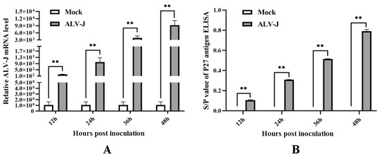 The proliferation viability of ALV-J-SD1005 strain in DF-1 cells at different times post-inoculation. (A) ALV-J gp85 mRNA expression levels in the cells were detected using qPCR; (B) ALV P27 antigen titers in the cells supernatant were detected using P27 antigen ELISA kit. **, p < 0.01.