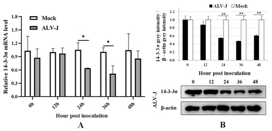 14-3-3σ expressions in the DF-1 cells infected with ALV-J-SD1005 strain were detected using qPCR and Western blot methods at different times post-inoculation. The results show that 14-3-3σ mRNA expressions in ALV-J-infected cells at 24 and 36 hpi were significantly decreased (Figure 2A), and the protein expressions were also significantly decreased from 24 hpi to 48 hpi compared with those in the control groups (Figure 2B). These results indicate that ALV-J-SD1005 strain can dramatically down-regulate 14-3-3σ expressions in DF-1 cells.