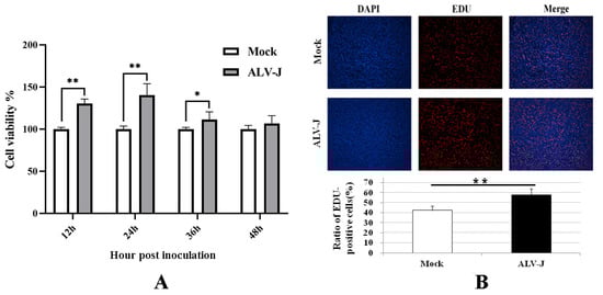 ALV-J-SD1005 strain promotes the proliferation of DF-1 cells. (A) The proliferation viability of DF-1 cells at different times post-virus inoculation was detected using CCK-8 method; (B) Proliferation viability of DF-1 cells at 36 hpi was detected using EDU fluorescence staining and microscopic examination. *, p < 0.05; **, p < 0.01.