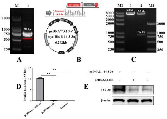 To analyze the roles of chicken 14-3-3σ protein on the cell proliferation induced by ALV-J-SD1005 infection, the specific primers were designed and synthesized to amplify 14-3-3σ gene with the size of 792 bp from chicken liver (Figure 4A); a recombinant eukaryotic expression plasmid containing chicken 14-3-3σ gene (pcDNA3.1-14-3-3σ) was constructed using the pcDNA3.1 plasmid containing His-tag (Figure 4B) and identified by double digestion test and nucleic acid electrophoresis analysis. The results show that an enzymatic fragment of the same size as the target gene was obtained (Figure 4C lane 2). The pcDNA3.1-14-3-3σ plasmid and the control plasmid (pcDNA3.1-His) were transfected into DF-1 cells, respectively; after 24 hpt, total RNA and total protein in the cells were extracted to detect the over-expression efficiency by qPCR and Western blot methods. The results showed that both mRNA and protein levels of chicken 14-3-3σ were significantly increased in pcDNA3.1-14-3-3σ groups (Figure 4D,E), indicating that chicken 14-3-3σ over-expression plasmid was successfully prepared.