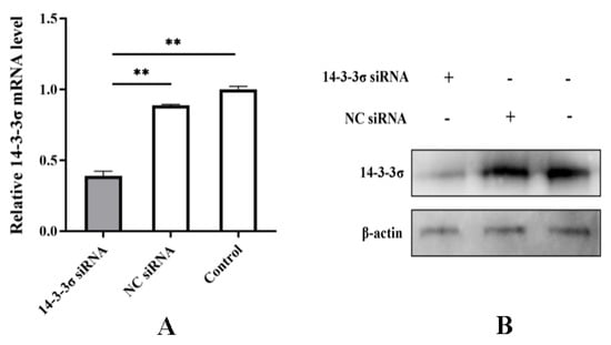 An interfering RNA (siRNA) against the 161st base site of chicken 14-3-3σ gene (14-3-3σ siRNA) and a negative control siRNA (NC siRNA) were designed and synthesized according to the design principle of siRNA. They were transfected into the DF-1 cells, respectively. After 24 hpt, total RNA and total protein were extracted to detect the knockdown efficiency. The results show that both mRNA and protein expressions of chicken 14-3-3σ were significantly reduced and the knockdown efficiency was up to 65~70% (Figure 5A,B), indicating that the prepared small interfering RNA can efficiently knockdown the expression of chicken 14-3-3σ.