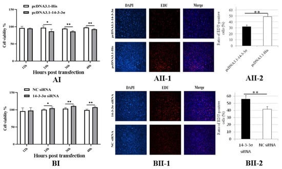 Effects of chicken 14-3-3σ over-expression and knockdown expression on the cell proliferation of ALV-J-infected DF-1 cells. (AI,BI), DF-1 cells proliferation viabilities at different hpt were detected using CCK-8; (AII,BII), DF-1 cells in division at 36 hpt were detected using EDU fluorescence staining and statistically analyzed. *, p < 0.05; **, p < 0.01.