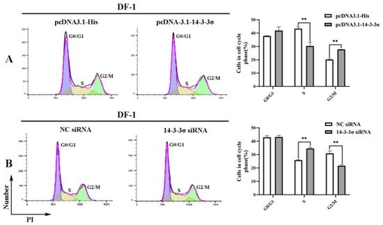 Regulation of chicken 14-3-3σ over-expression and knockdown expression on the division cycle of DF-1 cells infected with ALV-J-SD1005 strain. (A (Left)) and (B (Left)), DF-1 cell ratios of different division stages at 36 hpt were detected using flow cytometry; (A (Right)) and (B (Right)), DF-1 cell ratios of different cell cycles at 36 hpt were statistically counted. **, p < 0.01.