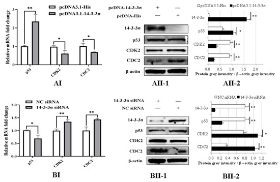 Regulations of chicken 14-3-3σ over-expression and knockdown expression on the expressions of p53/CDK2/CDC2 cyclin factors in ALV-J-infected DF-1 cells. (AI,BI), mRNA expressions of p53/CDK2/CDC2 cyclin factors at 36 hpt were detected using qPCR and statistically analyzed; (AII,BII), protein expressions of p53/CDK2/CDC2 cyclin factors at 36 hpt were detected using Western blot and statistically analyzed. *, p < 0.05; **, p < 0.01.