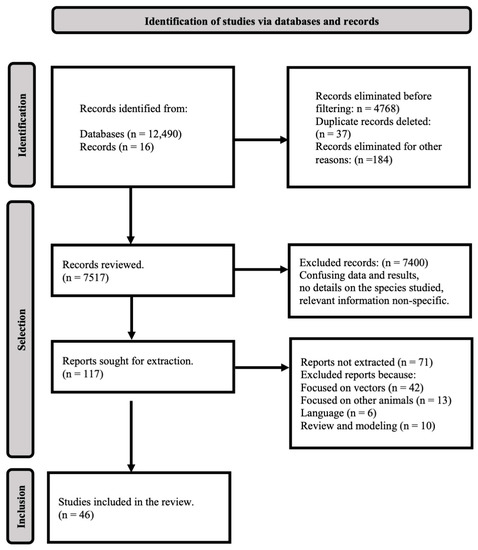 The literature review of mammalian arbovirus records in the Neotropics was conducted between 1 June and 31 July 2021 under the Preferred Reporting Items for Systematic Reviews and Meta-Analyses PRISMA 2020 Checklist reporting guide and the PRISMA 2020 flowchart [80,81] that describe the process for literature exploration and justification for the selection of each investigation [82,83].