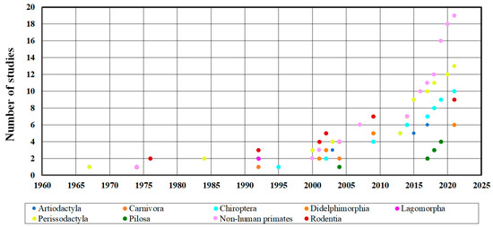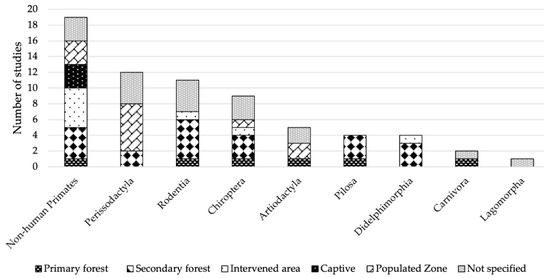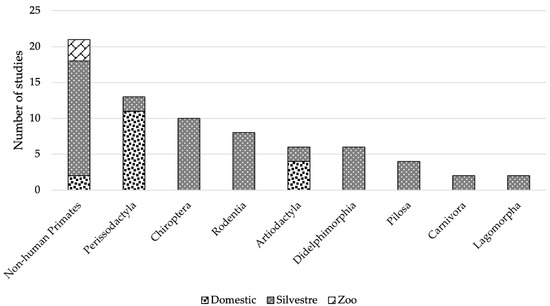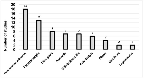 The results of the literature review identified that monitoring efforts have focused on nine taxonomic orders: mon-human primates (n = 18), Perissodactyla (n = 13), Chiroptera (n = 8), Rodentia (n = 7), Didelphimorphia (n = 7), Artiodactyla (n = 6), Pilosa (n = 4), Carnivora (n = 2), and Lagomorpha (n = 2) (Table A2 and Figure 2).