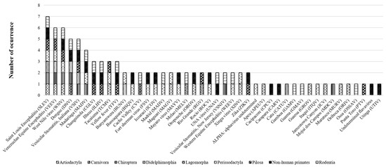 The arboviruses recorded in most mammalian orders in the Neotropics are the Saint Louis encephalitis virus (SLEV) (n = 7), the Venezuelan equine encephalitis virus (VEEV) (n = 6), and the West Nile virus (WNV) (n = 6) (Figure 5).