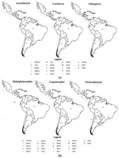 (a) Geographical location of arboviruses recorded by mammalian order in the Neotropics. (b) Geographical location of arboviruses recorded by mammalian order in the Neotropics. (c) Geographical location of arboviruses recorded by mammalian order in the Neotropics. Note: The concordance between the abbreviation of viruses and their full names is derivated from Table 1.