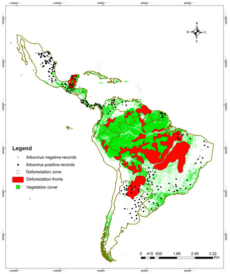 The World Wide Fund for Nature has compiled and analyzed in the shape file the global data on significantly increasing deforestation and degradation trends [95], which were used for visualization purposes [96]. We added the positive arbovirus records for the Neotropics identified in the literature review. The characteristics of the habitat described in the articles, either in front of deforestation or with vegetation cover, were taken into consideration.