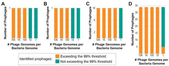 Induced prophages identified for a single bacterium (A) and mock communities (B–D). In the first test (A), a single prophage sequence with 100× genome coverage was added to bacterial reads producing a PtoH ratio of 10,000:1, 1000:1, 100:1, 10:1, and 1:1. (B) The same prophage sequence used in our prior test, again represented by reads at a 100× genome coverage, were added to reads from seven bacterial strains; each strain independently was sampled to produce the 5 different PtoH ratios tested. (C) A total of 10 prophage sequences and the seven bacterial genomes were examined at five different PtoH ratios. (D) 34 prophage sequences and the seven bacterial genomes were examined at five different PtoH ratios. For all charts, if the prophage(s) were identified and met/exceeded the 99% threshold, they are shown in orange. If they did not meet/exceed the threshold, they are represented by green.