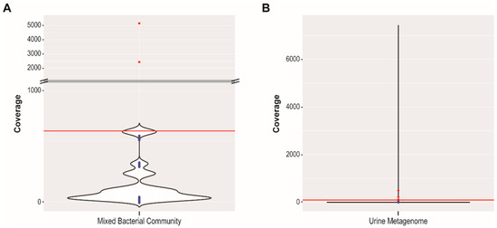 Density distribution of the coverage of the bacterial contigs from the (A) mixed community and (B) urine metagenome. The bacterial contig coverage values are shown by the density plot, where the width of the plot corresponds to the number of contigs with that coverage. The 99% threshold is shown by the red line. Predicted prophage sequences exceeding this threshold are shown as red circles, while predicted prophage sequences that do not meet this threshold are shown in blue circles. Density plots, such as those shown here, are automatically produced by PIE.