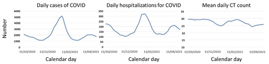 Temporal series analysis for daily cases and hospitalizations by COVID-19 and mean CT counts. CT, cycle threshold in RT-PCR-positive patients for SARS-CoV-2 in nasopharyngeal swabs.