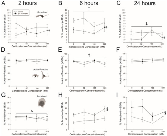 The proportion of surveillant microglia at 2 h (A), 6 h (B) and 24 h post-treatment (C). The proportion of active/reactive microglia at 2 h (D), 6 h (E) and 24 h post-treatment (F). The proportion of amoeboid/phagocytic microglia at 2 h (G), 6 h (H) and 24 h post-treatment (I). Figure (A,D,G) contain inset representative images of a surveillant, active/reactive, and amoeboid microglia, respectively (scale bare in A = 20 µm). † main effect of incubation time wherein 6 h significantly differs from 2 h; ‡ main effect time wherein the indicated time significantly differs from all other time-points; * main effect for gp120 to significantly differ from media control; § time × gp120 interaction wherein gp120 significantly differs from media control at 6 and 24 h only; ^ main effect of incubation time wherein the indicated time point is significantly different from all other time points; p < 0.05.