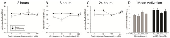 The average activation score of microglia at 2 h (A), 6 h (B) and 24 h post-treatment (C) and the mean activation score across all time-points (D). § time × gp120 interaction wherein gp120 significantly differs from media control at 6 and 24 h only; * gp120 × corticosterone interaction wherein gp120-exposure significantly increases activation of all microglia except those exposed to 100 nM corticosterone; p < 0.05.