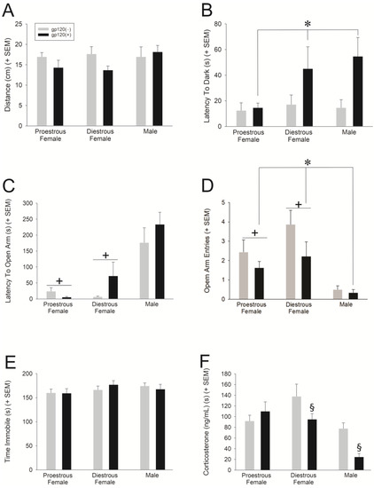 Mice were behaviorally assessed in an open field (A), light-dark transition task (B), elevated plus maze (C,D) and a tail suspension test (E). Circulating corticosterone was assessed from whole trunk blood (F). * main effect of genotype; + main effect of sex, wherein females are significantly different from males, irrespective of estrous cycle phase; § gp120 × sex interaction, wherein gp120(+) diestrous females and males significantly differ from their respective gp120(−) controls, p < 0.05.
