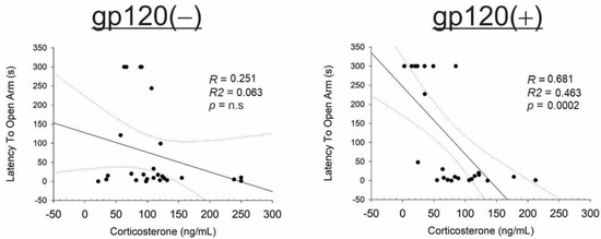 Circulating corticosterone levels were also analyzed via simple linear regression with dependent measures. Among gp120(+) mice, but not gp120(−) controls, circulating corticosterone negatively correlated with the latency to enter the open arms of an elevated plus maze (Figure 4), indicating reduced anxiety-like behavior when corticosterone is elevated. Notably, older age was also associated with greater circulating corticosterone in gp120(+) mice (r = 0.53, R2 = 0.28, p = 0.01), and this relationship was not observed in the gp120(−) controls.