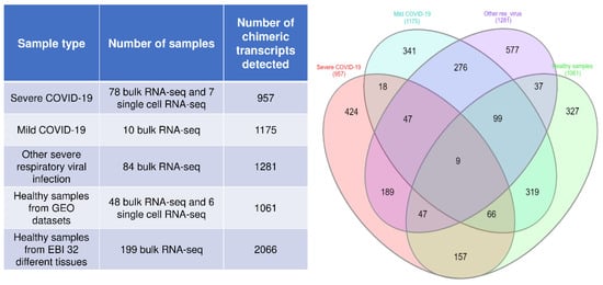 We identified a total of 957 chimeric transcripts from 78 bulk RNA-seq and 7 single-cell RNA (scRNA)-seq data from severe COVID-19 patients. In total, 1175 chimeric transcripts were identified in mild COVID-19 patients from 10 bulk RNA-seq samples, and 1281 chimeric transcripts were identified in various severe respiratory viral infections from 84 bulk RNA-seq samples. Moreover, we also identified 1061 chimeric transcripts from 54 healthy samples, while 2066 chimeric transcripts were identified in 199 samples from 32 normal tissues. Chimeric transcripts were observed to be abundant in all samples analyzed (Table S1 (Supplementary Materials)). However, from a pathological perspective, it would be interesting to identify the chimeric transcripts that are specific to severe COVID-19 infections, as well as those that are commonly expressed across multiple severe viral infections. We have identified that 44.3% (424 out of 957) of chimeric transcripts identified in the severe COVID-19 samples are unique to severe COVID-19 infections (Figure 1). Furthermore, we have identified 189 chimeric transcripts, which are common to severe COVID-19 infection and other severe respiratory viral infections. These results indicate that a significant number of chimeric transcripts detected in individuals are common to severe COVID-19 and other severe respiratory viruses.