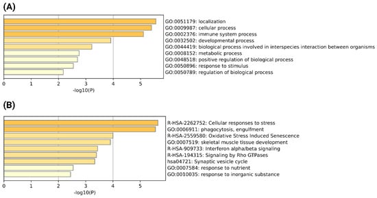 (A) GO biological process enrichment analysis of the parental genes of severe COVID-19 specific recurrent chimeric transcripts; (B) Top-most enriched processes and pathways of the parental genes of severe COVID-19 specific recurrent chimeric transcripts detected by Metascape (p-value cutoff < 0.05).