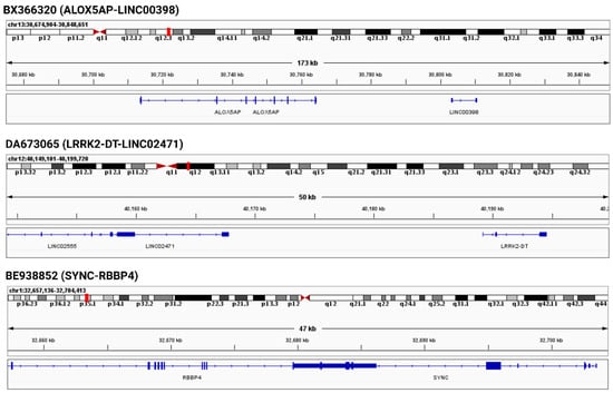 Several chimeric transcripts could be generated by the non-canonical splicing-based mechanisms, such as the trans-splicing and cis-splicing of adjacent genes (cis-SAGe) [25]. Trans-splicing is the mechanism by which two transcripts from two different genes could fuse and generate a novel chimeric transcript [53,54,55,56]. However, the mechanism of trans-splicing events is not well understood in humans, and no such computational method exists that can predict whether a chimeric transcript is generated by a trans-splicing mechanism. cis-SAGe is a frequent mechanism in human cancers and other complex diseases in which this mechanism generates a significant number of chimeric transcripts [17,18,57,58,59]. However, a recent study demonstrated that cis-SAGe is the common mechanism for generating chimeric transcripts in healthy human cells [17,22]. cis-SAGe is the intergenic splicing of directly adjacent genes with the same transcriptional orientation, which can generate chimeric transcripts [60]. We performed the genomic neighborhood analysis of the parental genes from severe COVID-19 specific recurrent chimeric transcripts, and we found seven confirmed cases where those chimeric transcripts were generated by cis-SAGe analysis (Table S2). Integrative Genomics Viewer (IGV) [61] was used to visualize the adjacent genes. Figure 3 and Figure S1 support the close proximity of the two genes from different recurrent severe COVID-19 specific chimeric transcripts and highlight the potentiality of cis-SAGe mechanism.