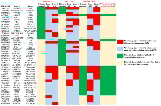 If the chimeric transcripts alter the functionality of their parental genes, then we should expect at least one of their parental genes could be differentially expressed. Interestingly, we observed in several instances that one of the parental genes of recurrent severe COVID-19 specific chimeric transcripts was differentially expressed. We observed consistent differential gene expression patterns for some chimeric transcript’s parental genes in all datasets; however, the chimeric transcripts mapped in some datasets, but not all (Figure 4). We chose strict criterion (Materials and Methods (2.2)) for chimeric transcripts detection to reduce the chances of obtaining false positives. So, as the quality of the RNA-seq data is different in each dataset, we could have missed some chimeric transcripts because fewer reads were mapped, or mapping read qualities were low. Similarly, the number of differentially expressed genes in each dataset depends on the quality of sequencing data and the p-value criteria selected to screen the differentially expressed genes. We chose the strict p-value, p <0.05, as the criterion for detection of differential gene expression, so there is a chance that we could have missed some differentially expressed genes in some datasets because of the quality of the sequencing data and read count bias. Interestingly, instead of the difference of sequence quality in different datasets, we mapped all the recurrent severe COVID-19 specific chimeric transcripts detected in the E-MTAB-10926 samples in the single-cell high-quality (scRNA)-seq dataset from the PRJNA633393 samples. Therefore, the production of the chimeric transcripts could be the important signature behind the generation of stress responses leading to COVID-19 severity development. Furthermore, we found 189 common chimeric transcripts unique to both severe COVID-19 and other severe respiratory viral infections whose parental genes were enriched in adaptive immune response and inflammatory response. This could signify these chimeric transcripts might be associated with stress responses associated with dysfunctional immune responses common to multiple respiratory viral severe infections.