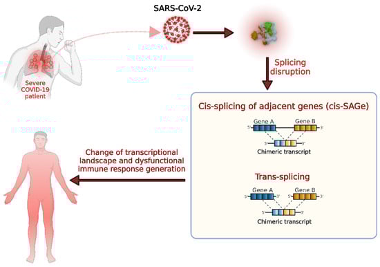 The ongoing COVID-19 pandemic is caused by SARS-CoV-2, a recently identified member of the Coronaviridae family [1,2]. The clinical representation of COVID-19 is variable, and sometimes it can lead to the development of disease severity resulting in immune dysfunction, acute respiratory distress syndrome (ARDS), and multi-organ failure [3,4,5]. Despite several studies, the molecular mechanisms behind the development of severe COVID-19 are still unclear. During the severe COVID-19 infection, SARS-CoV-2 antagonizes interferon (IFN) induction and IFN signaling, which generates dysfunctional immune response [6,7,8,9,10,11,12]. Recent studies demonstrated that SARS-CoV-2 suppresses the interferon (IFN) response by disrupting the host cell splicing [13]. Aberrant splicing and dysregulation of transcripts were found to be strongly correlated with the clinical severity of COVID-19 [14,15].