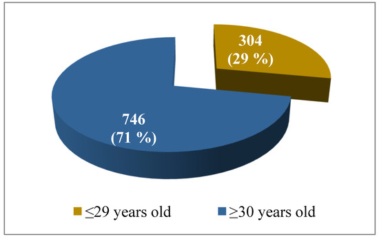 Out of the total number of tested women (N = 1050), 304 (29%) of them were ≤ 29 years old and 746 (71%) were ≥30 years old (Figure 1).
