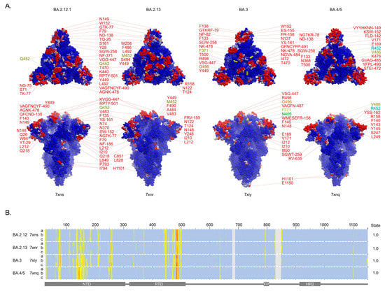 - Wang, Q.; Guo, Y.; Iketani, S.; Nair, M.S.; Li, Z.; Mohri, H.; Wang, M.; Yu, J.; Bowen, A.D.; Chang, J.Y.; et al. Antibody evasion by SARS-CoV-2 Omicron subvariants BA.2.12.1, BA.4 and BA.5. Nature 2022, 608, 603–608. [Google Scholar] [CrossRef]
