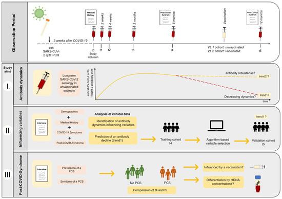 Observation period and study aims. Recovered COVID-19 subjects were enrolled into the study and longitudinal follow-up was performed, including blood sampling and structured interviews. I. Long-term SARS-CoV-2 serology was monitored in unvaccinated subjects to assess declining (trend1) and stable antibody dynamics (trend2). Moreover, the booster effect of vaccination was investigated. II. Clinical data were examined to find variables that could help to identify subjects having a higher risk for declining anti-SARS-CoV-2-antibody titers (trend1). A random forest algorithm was used to identify potential dynamics predicting variables based on the t4-training (6 months) cohort, and potential models were validated using unvaccinated t5 subjects (12 months). III. The prevalence and the symptoms of a post-COVID-syndrome (PCS) were compared between t4 (6 months) and t5 (12 months) appointments. Furthermore, the discriminatory potential of cfDNA concentrations collected in the early post-disease phase (t0) was evaluated, and the impact of vaccination on a preexisting PCS was considered.