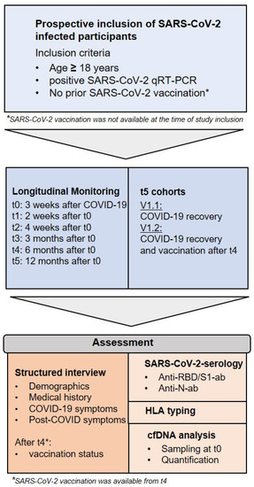 From April 2020 to October 2021, subjects aged 18 years and older were enrolled in the Immunitor Study at University Medical Center Mannheim, Germany, after recovery from SARS-CoV-2 infection confirmed by qRT-PCR. The Institutional Review Board (2020-556N) approved the study protocol, and the study was conducted in accordance with the Declaration of Helsinki. Research Electronic Data Capture (REDCap), a secure web platform for online data acquisition, was used for the initial standardized survey of medical and personal data at the study entrance, as described in more detail in preliminary work [9]. The assessment of PCS-associated symptoms reported 6 months after study entry was repeated at 12 months after study enrolments.