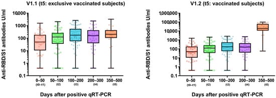 Longitudinal anti-SARS-CoV-2-anti-RBD/S1 dynamic (U/mL) in recovered COVID-19 subjects. V1.1 cohort of t5 appointment includes only unvaccinated subjects (left figure). Vaccinated subjects were included in the V1.2 cohort at t5 (right figure).