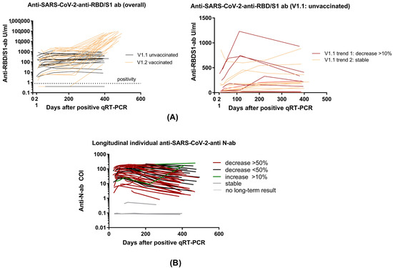 Individual longitudinal Anti-SARS-CoV-2-antibody dynamics. (A) Long-term individual anti-SARS-CoV-2-RBD/S1 antibodies in overall cohort differentiated between vaccinated and unvaccinated subjects (left figure). V1.1 unvaccinated divided into trend 1 (decreasing antibodies) and trend 2 (increasing antibodies). (B) Long-term individual anti-SARS-CoV-2-N-antibodies (COI). A decrease of more than 50% is illustrated by the color red, a decrease < 50% by the color black, and an increase of >10% by the color green. Stable levels and subjects without long-term results are presented in gray.