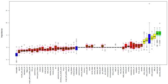 For establishing a clinical prediction model of declining Anti-SARS-CoV-2 anti-RBD/S1 dynamics, we used a random forest approach, assessing the importance of potential predictor variables by comparison with so-called shadow variables. These shadow variables are generated for each real variable by permutation and a statistical test is performed, comparing the importance of the real variables and the maximum importance of all shadow variables. If the real variable is significantly more important than the shadow variable, the algorithm assigns high importance to the feature [31,32]. The training set included all t4 subjects who were not categorized into subpopulation V1.1, unvaccinated recovered subjects. The following parameters were included in this training dataset: COVID-19 symptomatic (fever, night sweat, diarrhea, cough with and without sputum, shortness of breath, muscle pain, nausea, loss of smell or taste, other symptoms), treatment type (ambulatory, inpatient, ICU), preexisting medical history (immune, autoimmune, vascular, pulmonary, gynecological, cancer and other diseases), medications, blood group, gender, age, BMI, smoking status, the existence of PCS, and symptom differentiation of PCS (olfactory, gustatory or respiratory impairment, fatigue, exhaustion, hair loss, cognitive symptoms, or depression). Kidney and liver diseases were likewise inquired during the initial anamnesis. Still, since none of the training cohort subjects reported aforementioned disease conditions of these types, an inclusion in the feature selection was not feasible. As a validation dataset, the results of the t5 appointment of the V1.1 cohort were used, containing the identical features listed above. For statistical computing, the R (https://www.r-project.org (accessed on 5 January 2022)) version 4.1.1 software was utilized.