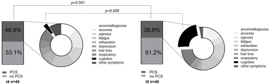 This segues into the third aim of the study, as we investigated the dynamics of a PCS 12 months after study inclusion. At the t5 appointment, 38.6% of overall subjects suffered from this syndrome, showing a slight non-significant decreasing tendency compared to t4 (t4: PCS 46.9, p = 0.541). Regarding the pathognomonic loss of smell and taste, there was a slight, but not significant, tendency of reconstitution of sensory perception (p = 0.356). Likewise, in either anosmia or ageusia, the persistence of symptoms beyond 1 year after the disease occurred (anosmia: p = 1.0; ageusia: p = 0.673, Table 4). However, the sensory-affected subjects stated that there was a subjective improvement compared to the acute phase of the disease. Regarding quality, the acute symptoms were described mainly as hyposmia/dyssomnia or hypogeusia/dysgeusia. Riestra-Ayora et al. also described such long-term changes in a 6-month course. Here, 11% of the subjects showed persistent sensory symptoms compared to the acute disease, which presented as olfactory and gustatory dysfunction [42]. We found a comparably significant decrease (4/35) in anosmia between acute COVID-19 and t5 with persistence in 11.4% of subjects (p < 0.001 **). This supports and even extends previous results over a longer period [33,42]. Beyond these characteristic symptoms of the acute phase, the long-term monitoring revealed an evident change from the initial sensory symptoms to cognitive manifestations, such as concentration and attention deficits. Interestingly, these complaints increased significantly at t5 (t5: 8/19, t4: 1/23, p = 0.006) and, together with fatigue (5/19) and exhaustion (6/19), were reported as particularly affecting the quality of life. We compared vaccinated and unvaccinated subjects regarding the dynamic of a PCS, and no significant difference in the existence of a PCS at t4 and t5 could be observed. This indicates that vaccination after COVID-19 recovery might not influence the evolution of a preexisting PCS.