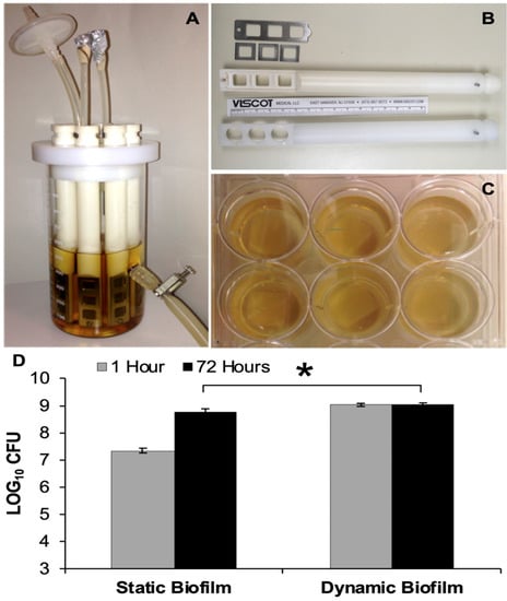 Biofilms Models. (A) CDC Biofilm reactor used to grow 48-h dynamic biofilms; (B) ‘In-house’ rod designed to hold three square PEEK membranes with metal frames versus manufacturer’s rod used to hold three PEEK disc coupons; (C) Multi-well plates used to grow 48-h static biofilms on PEEK membranes; (D) Bacterial load present on static and dynamic biofilms, which were transferred to small Petri plates and enumerated at t = 1 h and t = 72 h. Error bars represent the standard error of the mean. * Statistical significance (p ≤ 0.05).