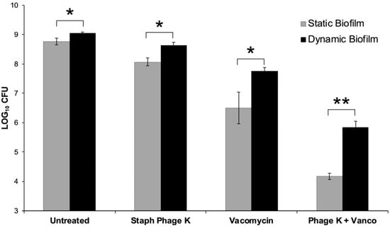 Comparison of treatment effects on dynamic versus static biofilms. 48-h old biofilms were treated for 72-h with: Staph phage K (109 PFU); vancomycin (42 µg/mL); or a combination of phage and vancomycin. An untreated (control) group was set up for each biofilm type. There were statistically significant differences in bacterial loads between the static and dynamic biofilms post-treatment. Error bars represent the standard error of the mean. * Statistical significance (p ≤ 0.05). ** Statistical significance (p ≤ 0.001).