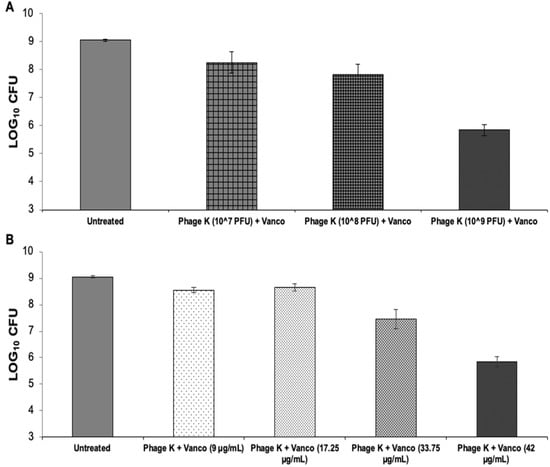 Vancomycin and staph phage K combinations—bacterial loads 72-h post-treatment on 48-h dynamic biofilms. (A) Biofilms treated with a combination of vancomycin at 42 µg/mL and staph phage K at the following concentrations: 107 PFU/mL; 108 PFU/mL; and 109 PFU/mL. (B) Biofilms treated with a combination of staph phage K at 109 PFU/mL and vancomycin at the following concentrations: 9 µg/mL, 17.25 µg/mL, 33.75 µg/mL and 42 µg/mL. Error bars represent the standard error of the mean.