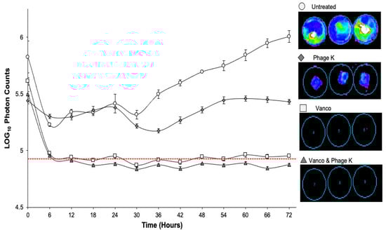 Bioluminescent activity of dynamic biofilms over 72-h treatment period. Vertical bars represent standard error of the mean. Dotted red line shows limit of bioluminescence detection of imaging system. Treatments included: untreated; vancomycin; staph phage K; combination of vancomycin and staph phage K. Luminescent intensity is displayed on a rainbow color scale with violet being least intense and red being most intense. Minimum and maximum intensities are shown to be 300 and 3000, respectively.