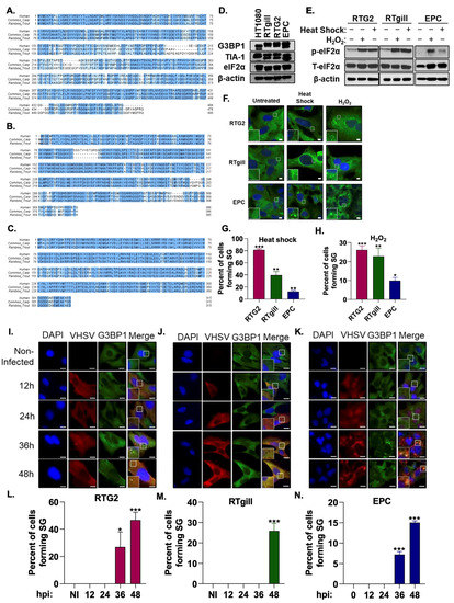 VHSV infection induces stress granule formation. Multiple amino acid sequence alignments of human, common carp and rainbow trout (A) G3BP1 (Homo sapiens, Q13283; Cyprinus carpio, XP_018929741; Oncorhynchus mykiss, XP_021417518;), (B) TIA-1 (Homo sapiens, P31483; Cyprinus carpio, KTF92398; Oncorhynchus mykiss, XP_021457804), (C) eIF2α (Homo sapiens, P05198; Cyprinus carpio, XP_018935983; Oncorhynchus mykiss, XP_021429557). Identical amino acids are highlighted with dark blue and similar amino acids are with light blue color. (D) Cell lysates of HT1080 (human fibrosarcoma), RTgill, RTG2 (rainbow trout) and EPC (Fathead minnow) cells were analyzed by immunoblotting with antibodies against G3BP1, TIA-1 and eIF2α. β-actin was used as loading control. RTG2, RTgill and EPC cells were subjected to heat shock (37 °C, 1 h), or oxidative stress (5 mM H2O2, 3 h) and (E) phosphorylation of eIF2α in cell lysates was analyzed by immunoblotting, or (F) cells were fixed and stained with anti-G3BP1 antibodies to monitor stress granules and DAPI to stain the nucleus and (G,H) percent cells forming stress granules were quantitated. RTG2 (I,L) and RTgill (J,M) cells were infected with VHSV Ia and EPC (K,N) cells were infected with VHSV IVb (MOI = 1 pfu/cell) at indicated times hpi cells were fixed and stained with G3BP1 and anti-VHSV antibodies. (L-N) Percent cells forming SG were quantitated. Data represents mean ± SD. Scale bar 1 μm; * p < 0.05; ** p < 0.01; *** p < 0.001.