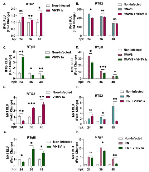 Regulation of host innate immune response by VHSV Ia. RTG2 cells (A,B) and RTgill cells (C,D) were transfected with IFN- β luc with or without fMAVS for 48 h, followed by infection with VHSV Ia for indicated times at MOI 1. Luciferase values were quantified and normalized to total protein levels and non-infected sample. RTG2 cells (E,F) and RTGill cells (G,H) were transfected with MX1-luc for 48 h, followed by infection with VHSV Ia for indicated times at MOI 1. Indicated cells were treated with rtIFN and luciferase values were quantified 24 h later and normalized to total protein levels and non-infected sample. Data represents mean ± SEM. ns, not significant; * p < 0.05; ** p < 0.01; *** p < 0.001, ns = “not significant”.