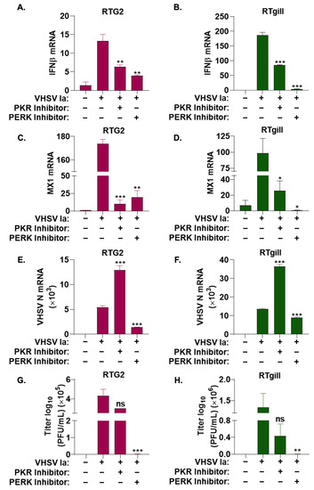 Role of ISR pathways on IFN signaling during VHSV infection. RTG2 (A,C,E,G) and RTgill (B,D,F,H) cells were treated with PERK inhibitor or PKR inhibitor 1 h prior to infection with VHSV Ia for 36 h and mRNA levels of (A,B) IFNβ, (C,D) MX1, or (E,F) VHSV N determined by RT-PCR. Data was normalized to spiked internal control and presented as fold change in expression compared to no treatment. (G,H) VHSV Ia titers were determined in supernatants of infected cells by plaque assays. Error bars reflect SEM. ns, not significant; * p < 0.05; ** p < 0.01; *** p < 0.001, ns = “not significant”.