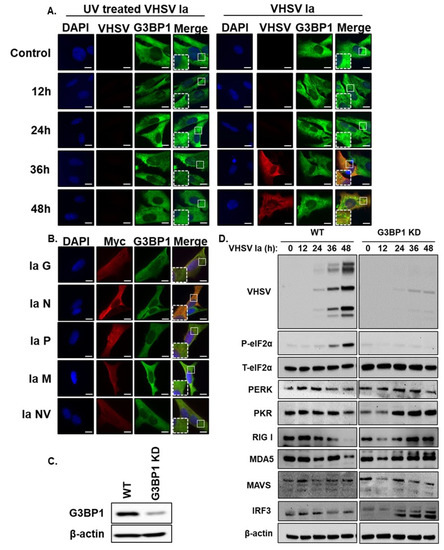 VHSV Ia infection caused significant increase in eIF2α phosphorylation, host translation arrest and SG formation, however viral proteins continue to be synthesized. Similar observations were made in response to VHSV IVb infection in EPC cells [68]. We first sought to clarify whether any VHSV products, viral proteins or replication intermediates, act to promote SG formation. The infection of RTgill cells with UV-inactivated virus that is unable to replicate in cells failed to induce SG compared to robust SG formation with active VHSV Ia replication, demonstrating the need for a replication intermediate in SG induction (Figure 6A). One of the common mechanisms employed by viruses is to interfere or promote SG formation by targeting eIF2α phosphorylation or use viral proteins to sequester SG components and inhibit SG assembly, or shield viral components from host detection in SG to promote viral replication. For instance, Hepatitis C Virus co-opts G3BP1 protein to regulate genome replication, viral assembly and egress [41,42]. Ebola Virus (EBOV) encodes VP35 that inhibits SG assembly by sequestering G3BP1 in viral inclusion bodies to favor replication, suggesting an important role of SG in viral pathogenesis [81]. HSV-1 expresses vhs protein that inhibits the phosphorylation of eIF2α [82]. Our results show that the individual expression of the VHSV Ia-encoded structural or nonstructural proteins alone cannot induce SG (Figure 5B). While not explored, it is possible that multiple viral proteins may together mediate this effect as it happens in a virally infected cell. Based on our previous studies with VHSV IVb, we speculate NV protein is required for the PERK mediated p-eIF2α and efficient viral protein synthesis with possible role in SG formation [68].