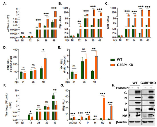 G3BP1 is a critical regulator of SG dynamics, RNA turnover, and translation. More recently, its role as a regulator of immune response highlights an important role in the crosstalk of virus-induced stress response and the activation of IFN signaling pathway [36]. SG formed during virus infection, avSG, recruit antiviral proteins and G3BP1 is required for its assembly [20,33,34]. We generated G3BP1 knockdown in RTgill cells using CRISPR/Cas9 gene editing (Figure 5C) and compared ISR activation and host innate immune response in cells infected with VHSV Ia. In cells with G3BP1 knockdown (G3BP1 KD), surprisingly, eIF2α was very weakly phosphorylated and a very low accumulation of viral proteins was detected compared to wild-type (WT) cells. No significant increase in total eIF2α or PERK, its upstream kinase, was detected on immunoblots. However, our results show that protein levels of ISGs such as PKR, RIG-I, MDA5 and MAVS increased at later infection times in G3BP1 KD cells. The expression of IRF3, a transcription factor required to induce IFN, did not vary between WT and G3BP1 KD cells (Figure 5D). These results suggest that G3BP1 is required for both host and viral protein translation, and in the context of viral infection, immune signaling proteins like IFN. As expected, G3BP1 KD cells produced significantly higher amounts of IFN measured in culture supernatants, that correlated with increased IFN mRNA levels and IFN promoter activity. An increase in IFN production induced higher levels of MX1, an ISG, as is evident by an increase in mRNA level and MX1 promoter activity (Figure 6A–E). Predictably, viral titers were low in G3BP1 KD cells, demonstrating a proviral effect of G3BP1. A recent study in another fish model of Grouper spleen cells infected with Red-Spotted Grouper nervous necrosis showed the requirement of G3BP1 and SG formation with an antiviral effect highlighting the diverse roles of G3BP1 and SG in viral infections [83]. In line with our observations, another study showed that G3BP1 is critical for murine and human norovirus replication. The authors showed that G3BP1 recruits ribosomal subunits and facilitates the translation of viral RNA using viral protein genome-linked (VPg) attached to the 5′ end of RNA genome [45]. Furthermore, the redistribution of G3BP1 to viral replication complexes promotes efficient viral replication [44]. Since G3BP1 KD cells produced significantly higher IFN, we sought to identify if any VHSV Ia proteins may augment IFN production in G3BP1 KD cells. The expression of VHSV Ia NV protein in RTgill cells upregulated IFN promoter activity 38-fold over WT cells and Ia N protein caused 25-fold increase (Figure 6G). Based on our previous study on VHSV IVb NV protein in host translation shut-off via PERK, and our observations on IFN induction in G3BP1 KD cells, we speculate that G3BP1 may directly or indirectly regulate viral translation by interacting with NV protein, while the contribution of N protein cannot be ruled out. Future studies will address if Ia NV and or N protein bind G3BP1 and if RNA-binding properties of G3BP1 is required for regulating translation as well as SG assembly.