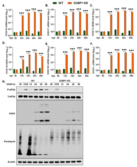 G3BP1 is required for viral protein expression. WT and G3BP1 KD cells were infected with VHSV Ia for indicated times at MOI = 1 and mRNA levels of (A) VHSV N, (B) VHSV P, (C) VHSV G, (D) VHSV M, (E) VHSV NV and (F) VHSV L was measured by qRT-PCR and normalized to spiked internal control and presented as fold change in expression compared to no treatment. (G) WT and G3BP1 KD cells were infected with VHSV Ia at MOI of 1. At indicated time points, cells were pulsed with puromycin (10 µg/mL) for 20 min and cell lysates were analyzed by immunoblotting using antibodies against p-eIF2α, T-eIF2α, puromycin and viral proteins were detected using VHSV antibodies. β-actin was used as loading control. Data are representative from two individual experiments. The data represent mean ± SD; WT: wildtype; KD: knockdown; NI: not infected; CHX: cycloheximide. *** p < 0.001.