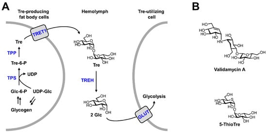 The other major storage sugar in insects is trehalose, which is the main sugar found in hemolymph. Trehalose, which is also found in fungi, bacteria, and plants, is a non-mammalian disaccharide consisting of two glucose units that are linked together by a 1,1-α,α-glycosidic bond (Figure 2A) []. Trehalose is synthesized in fat body adipocytes through trehalose phosphate synthase (TPS)-catalyzed conversion of UDP-glucose and glucose-6-phosphate to trehalose-6-phosphate, which is then dephosphorylated by trehalose-6-phosphate phosphatase (TPP) to give trehalose [,]. Trehalose is then secreted via trehalose-specific transporters (e.g., TRET1) into the hemolymph, where it serves as a circulating form of stored glucose []. Trehalose is a multifunctional molecule in mosquitoes, as it provides energy and promotes growth, metamorphosis, stress recovery, chitin synthesis, and flight [,,,,,,,,,,]. When needed for these functions, trehalose is hydrolyzed by an extracellular trehalose-specific glycoside hydrolase, or trehalase (TREH), yielding two molecules of glucose that can be imported into cells via glucose transporters (GLUTs) []. There are two forms of trehalase in insects, including: (i) trehalase 1 (Tre-1), which is soluble and has been identified in insect hemolymph, midgut goblet cells, and eggs; and (ii) trehalase 2 (Tre-2), which is membrane-bound and has been identified in flight muscle, follicle cells, ovary cells, spermatophore, midgut, and brain tissue [].