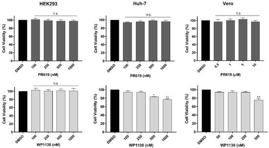 Cytotoxic effect of deubiquitinating enzyme inhibitors. HEK293, Huh-7, and Vero cells were exposed to PR-619 or WP1130 at the indicated concentrations, DMSO 0.1% was used as a control. After 24 h of treatment, cell viability was analyzed using the resazurin assay method. Data are represented as the mean + SD, and statistically significant differences are indicated as * p < 0.05, ** p < 0.01. n.s no significant differences.