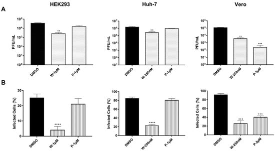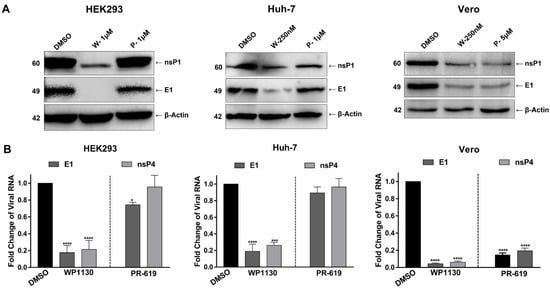 To assess whether the decrease in the infective viral progeny was due to a defect in viral protein synthesis or genome replication events in the early stage of the viral replication cycle; we evaluated the levels of both structural proteins, which are indispensable for virion formation, and nonstructural proteins, which are essential for genome replication, in cells treated with the inhibitors. In infected cells treated with DMSO, antibodies recognized a 49 kDa band corresponding to E1 and a 60 kDa band corresponding to nsP1 (Figure 4A). Exposure to the inhibitor led to a drastic reduction in the levels of both proteins; in HEK293T cells, the signal of the E1 protein disappeared completely after treatment with WP1130. In Vero and Huh-7 cells, a similar behavior was evidenced; levels of E1 protein were significantly reduced during WP1130 treatment, while nsP1 protein was reduced to a lesser extent. Notably, in Vero cells, PR-619 treatment affected the levels of both viral proteins. These results are consistent with the detection of low levels of E1 in cells treated with the DUB inhibitors using flow cytometry and could explain the decrease in the viral progeny titer (Figure 2).
